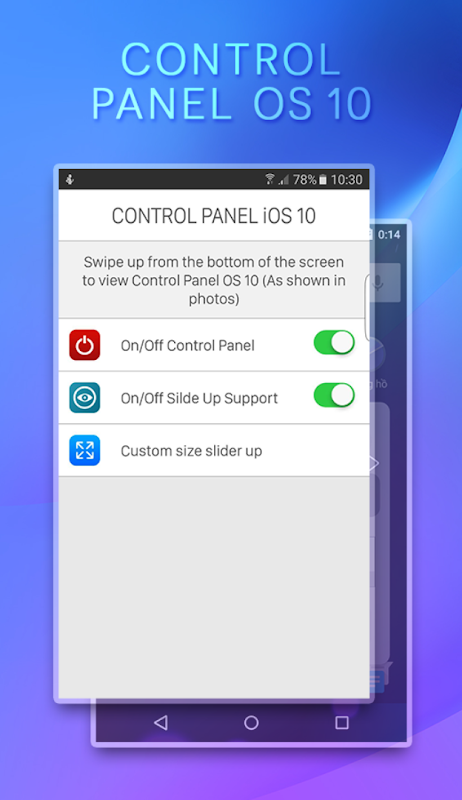 Control Panel - Control Center is a Control Center help you have planes control for device android style ịÓS 9. Control Center contain commonly used switches of Android system and all installed apps, you could quick settings your switch and open your favorite apps with control center.