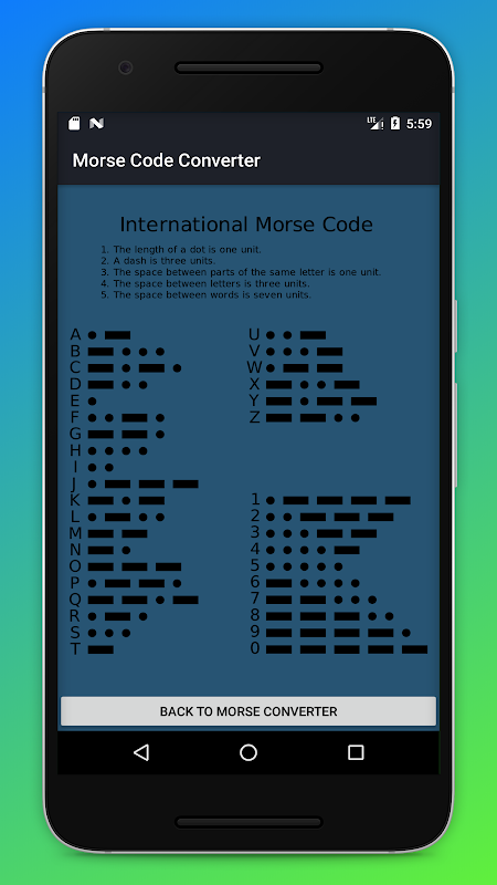 ☞ Código Morse é um aplicativo móvel que permite traduzir texto e o alfabeto Inspetor de Código Morse. O aplicativo Android converte texto em Morse e decodifica o Código Morse em texto alfabético.