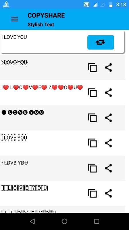 ◆ Stylish Text : input the normal text and convert with 31 stylish and fancy text, then copy and share with your friends,family and lover on various social networks and increase your relationship.
