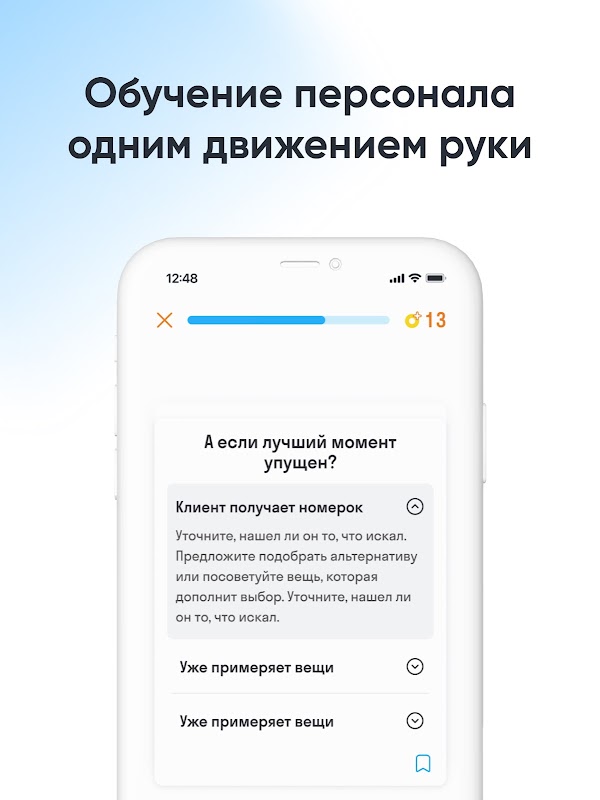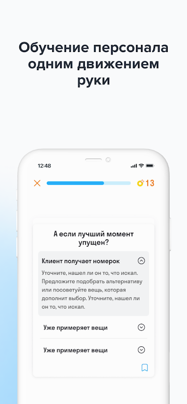 As aulas consistem em diferentes tipos de cartões: teoria, micro-testes, classificação, classificação, arquivos de áudio e vídeos. Em vez de teoria chata, é uma história real. O funcionário vive a história e aprimora seu conhecimento.