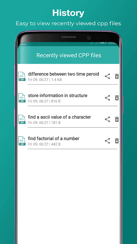 Por meio do aplicativo leitor de CPP, você pode facilmente obter arquivos CPP por meio do seletor de arquivos do armazenamento do dispositivo e permitir que você leia o arquivo CPP rapidamente. O visualizador de CPP mantém o histórico de todos os seus arquivos CPP visitados para que possa visualizá-lo rapidamente no futuro.