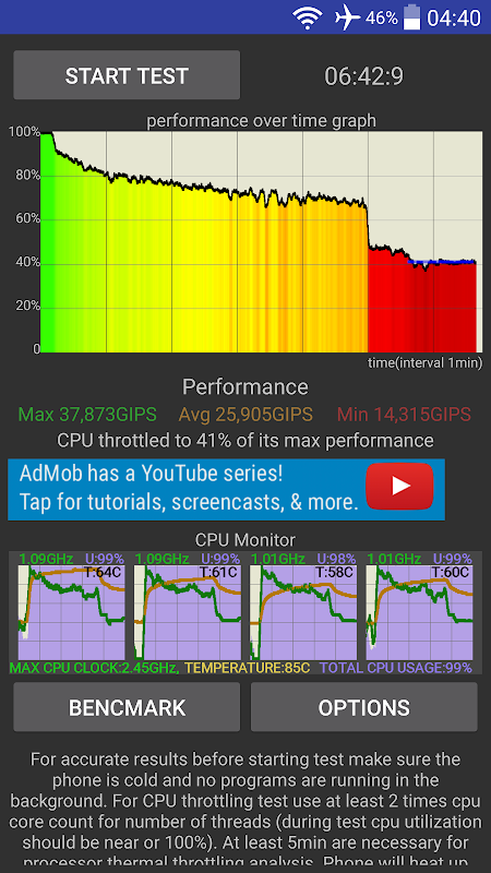 App cargas CPU com até 100 linhas e medidas de desempenho. Se o telefone pode lidar com resfriamento da CPU (a maioria não pode) desempenho vai ficar constante, mas se não puder CPU vai começar a desacelerar e velocidade irá diminuir.