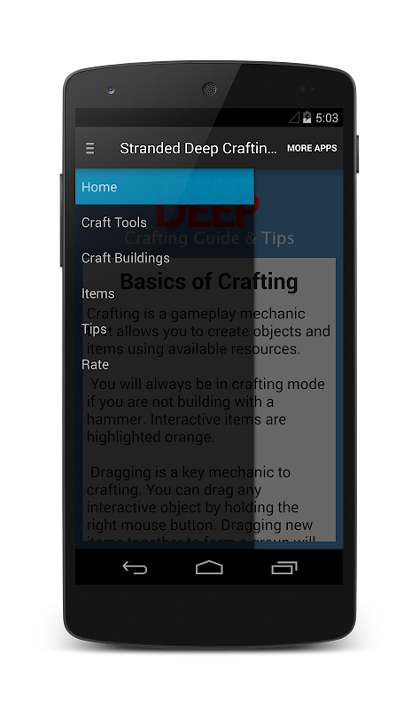 The app is a must have companion for your journey in the Stranded Deep game. This will help you with the game basics, crafting things and buildings, find items and some handy tips.