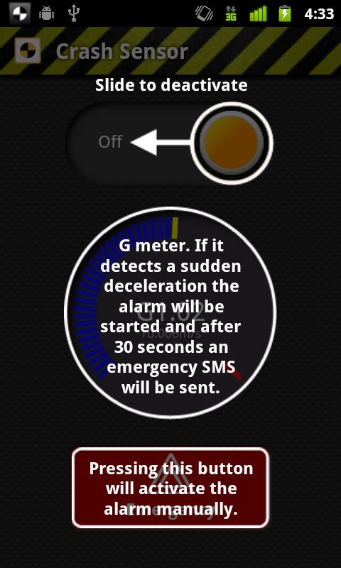 Constantly, it monitors the phone acceleration sensors in order to detect the sudden deceleration produced in a crash. In case of an accident an alarm will warn you that a crash has been detected and, if you don't cancel the alarm in 30 seconds, a SMS with your geographic coordinates will be sent to the phone number you have defined (only in the complete version).