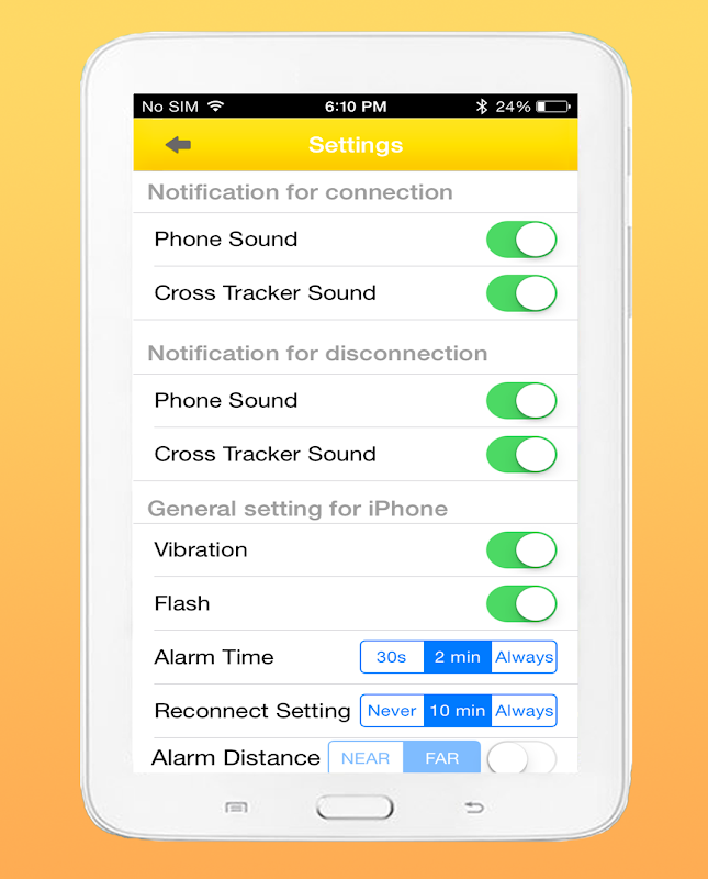 You can set to turn on/off the Phone Sound, Cross Tracker Sound when connection is paired or broken. Also you can set Vibration, Flash when alarming. Moreover, you can set the Alarm Distance which is NEAR or FAR and select the Ringtones of the phone when alarming.