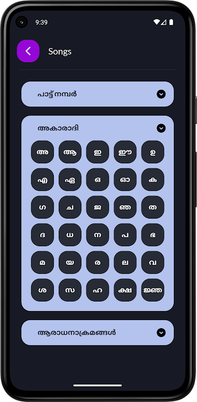 Esta versão do CSI KKD fornece músicas categorizadas como índice, letras no idioma malaiala