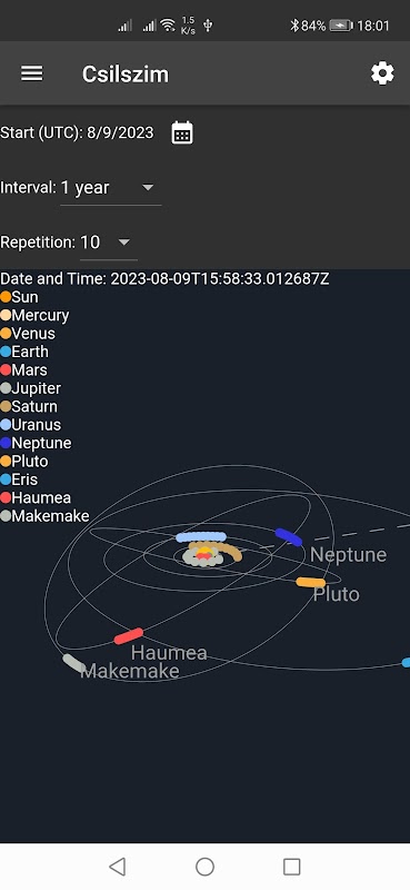 Ele mostra as órbitas e posições dos principais corpos do sistema solar. Ele será exibido pelo número especificado de vezes no intervalo especificado a partir da data especificada. As setas indicam a direção dos equinócios vernais. Você pode alterar a posição do ponto de vista arrastando/deslizando. Você pode aumentar e diminuir o zoom com a roda/aperto. Pode exibir planetas e alguns planetas anões e cometas.