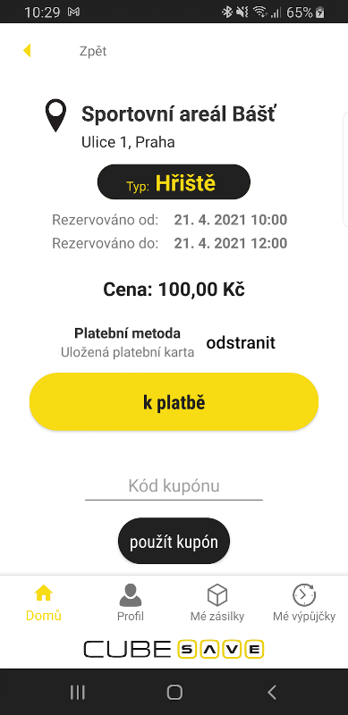 Nesta aplicação poderá reservar o tempo de utilização das instalações desportivas. Já lançamos um projeto piloto em Bášť e mais será adicionado. Estes sistemas de entrada desportiva inteligentes, designados por SISTEMA CUBESAVE SMART SPORT, permitem um funcionamento simples e eficiente das instalações desportivas sem a necessidade de funcionários e atividades relacionadas. O sistema controla o acesso ao campo de esportes em combinação com a possibilidade de guardar objetos pessoais, retirar equipamentos esportivos e permitir o acesso a vestiários e banheiros. Tudo incluindo o sistema de reservas, pagamento e faturação.