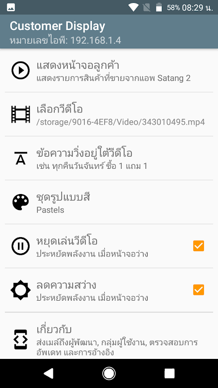 A tela é uma aplicação cliente que liga a aplicativos através de Wifi Satang2 listados por produto, preço, quantidade, valor total. Inclui cobrança ea mudança para o cliente e um leitor de vídeo, bem como uma lista.