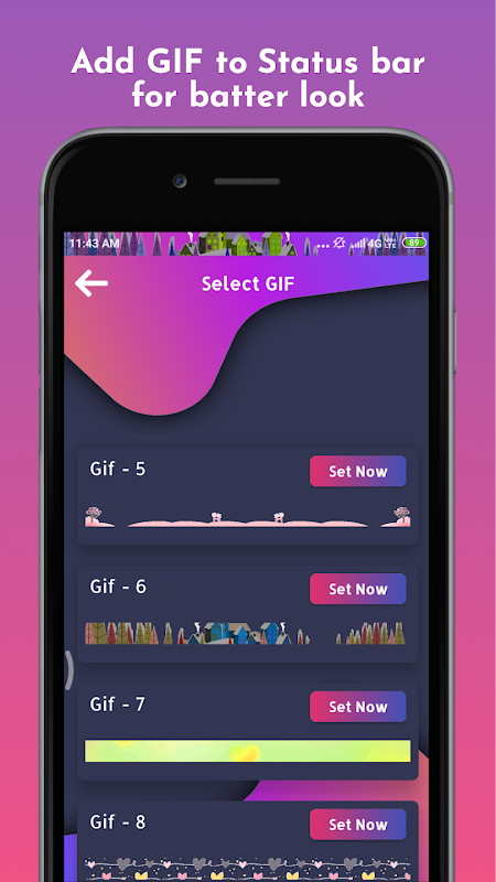 Diga adeus às barras de status comuns e sem graça! Com os recursos de personalização da barra de status, você pode escolher entre mais de 50 estilos coloridos, gradientes elegantes e molduras incríveis. Quer algo mais dinâmico? Adicione um GIF e veja sua barra ganhar vida! É fácil transformar sua barra de status colorida e deixá-la com a sua cara.