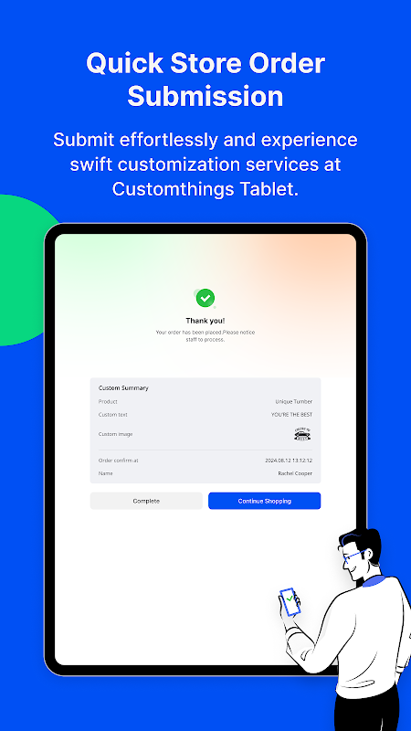 O Customthings Tablet APP é um aplicativo móvel projetado especificamente para serviços de personalização em lojas e baseados em eventos. Ele permite que os clientes selecionem produtos sem esforço, personalizem designs e enviem pedidos rapidamente por meio de grandes telas interativas.