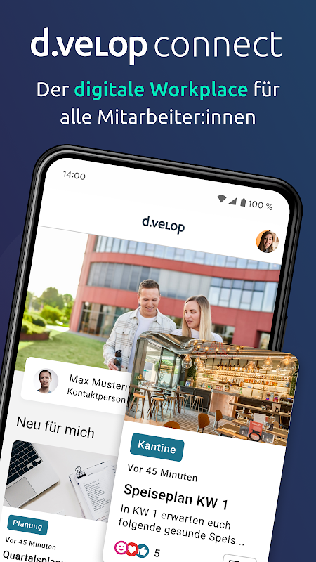 O aplicativo para funcionários d.velop é o local de trabalho digital para todos os funcionários – mesmo sem uma estação de trabalho PC permanente. Combina feed de notícias, canal de comunicação e banco de dados de conhecimento em um só lugar. Isso significa que os funcionários têm acesso direto a notícias sociais, eventos, autoatendimento para funcionários e muito mais, a qualquer hora e em qualquer lugar - de forma flexível e digital por meio do aplicativo.
