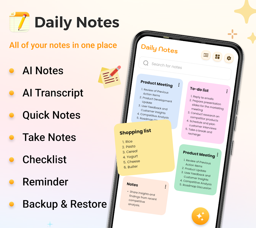 Organize sua vida sem esforço com o Daily Notes – Bloco de Notas, Lembretes. Seja para gerenciar tarefas, criar anotações detalhadas ou acompanhar eventos importantes, este aplicativo de notas completo ajuda você a se manter produtivo e livre de estresse com criação de notas com inteligência artificial, resumos inteligentes, notas de voz para texto e transcrição de reuniões ou palestras.