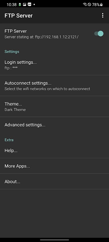 Este programa permite que você execute um servidor ftp no seu dispositivo Android. Isto significa que qualquer outro computador / dispositivo pode acessar os arquivos em seu dispositivo Android, enquanto o servidor ftp está em execução. Por exemplo, digitar "ftp: // ..." na barra de URL que o Firefox irá permitir que você para procurar os arquivos no seu dispositivo a partir de um PC desktop ou um laptop.