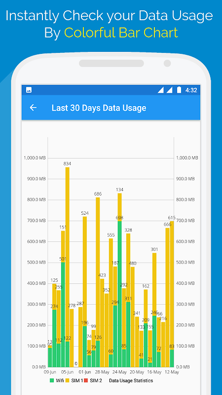 • Separate statistics for Mobile network (SIM1 and SIM2) and WiFi network.