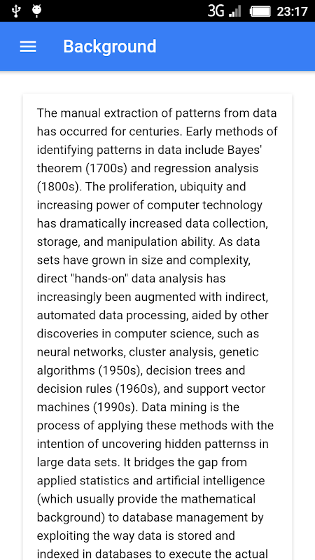 Data mining is the computational process of discovering patterns in large data sets involving methods at the intersection of artificial intelligence, machine learning, statistics, and database systems It is an interdisciplinary subfield of computer science.The overall goal of the data mining process is to extract information from a data set and transform it into an understandable structure for further use. Aside from the raw analysis step, it involves database and data management aspects, data pre-processing, model and inference considerations, interestingness metrics, complexity considerations, post-processing of discovered structures, visualization, and online updating Data mining is the analysis step of the "knowledge discovery in databases" process, or KDD.