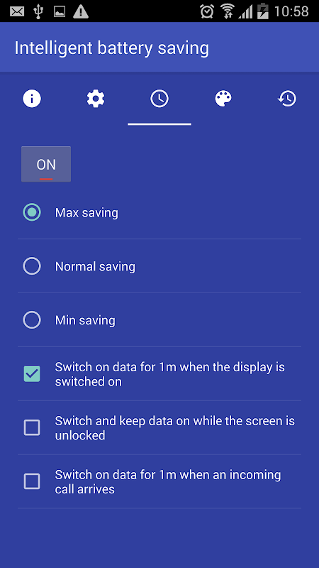 - (Opcional) auto desativar dados móveis quando o nível de bateria é inferior a um valor personalizado;