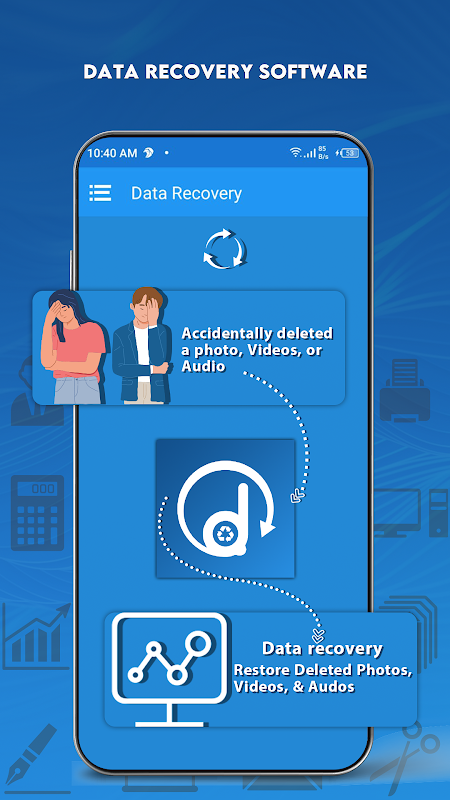 Sem mais complicações! Nosso aplicativo de Recuperação de Dados para Android e aplicativo de Recuperação de Fotos atua como sua solução. O aplicativo cria um backup dos dados recentemente deletados para fácil restauração. Acesse arquivos deletados e restaure fotos, áudio e vídeos com apenas alguns cliques.