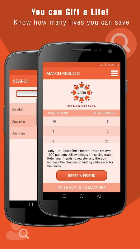 Ele também dá uma visão sobre o funcionamento do registro. Os doadores podem adicionar ou consulte mais doadores potenciais para o registro através deste App. Este, por sua vez, ajuda a aumentar a probabilidade de encontrar mais salva-vidas.