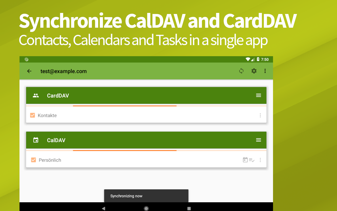 DAVx⁵ é a única solução que permite a sincronização completa para seus contatos (CardDAV), calendários (CalDAV) e tarefas (baseado em VTODO). O aplicativo é fácil de configurar e se integra perfeitamente ao seu aplicativo de calendário / contatos favorito (incluindo aplicativos padrão). Também pode ser usado separadamente, se você tiver CalDAV, CardDAV ou apenas tarefas.