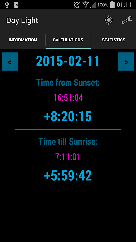 Além disso, o aplicativo mostra o tempo decorrido do nascer ou pôr do sol, e também o tempo restante para o pôr do sol (durante o dia) ou o nascer do sol (à noite).