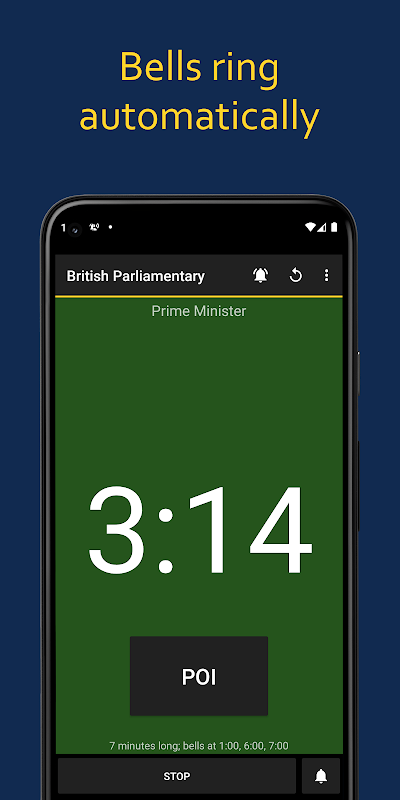 Deixe o Debatekeeper resolver o problema da cronometragem! Ele soará sinos automaticamente nos momentos certos ou pode vibrar e / ou piscar sua tela como sinais mais silenciosos, permitindo que você concentre sua atenção no debate.