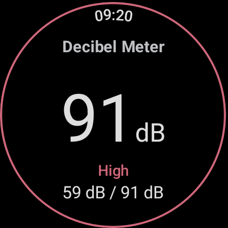A precisão do medidor de decibéis depende da qualidade do microfone do seu relógio Wear OS. A maioria dos relógios Wear OS possui microfones precisos o suficiente para a maioria das medições de ruído de uso geral. No entanto, é importante observar que o medidor de decibéis não consegue medir níveis de ruído acima de 94 dB com precisão.
