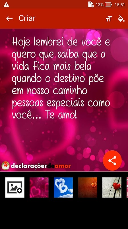 Novidade! O aplicativo Declarações de Amor agora permite que você monte um cartão de amor e compartilhe a imagem com a sua alma gêmea!