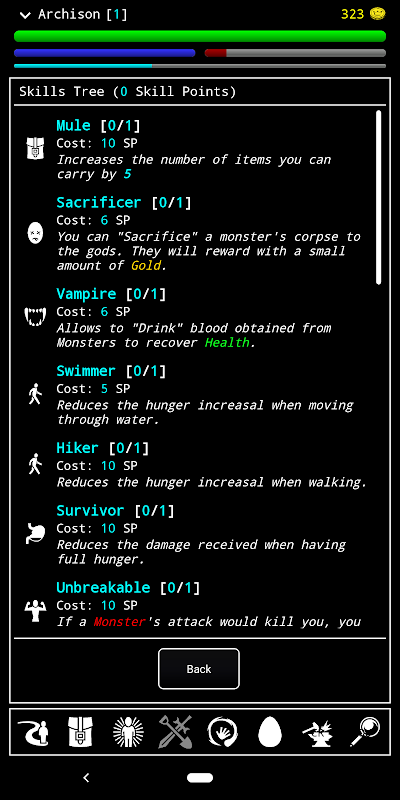 A solo indie-dev aims to bring an old-school style to modern day Android devices. This is accomplished with an easy to understand interface, a few iconic buttons, and several information screens. Players are empowered to navigate a proceedurally generated world full of danger and treasure.