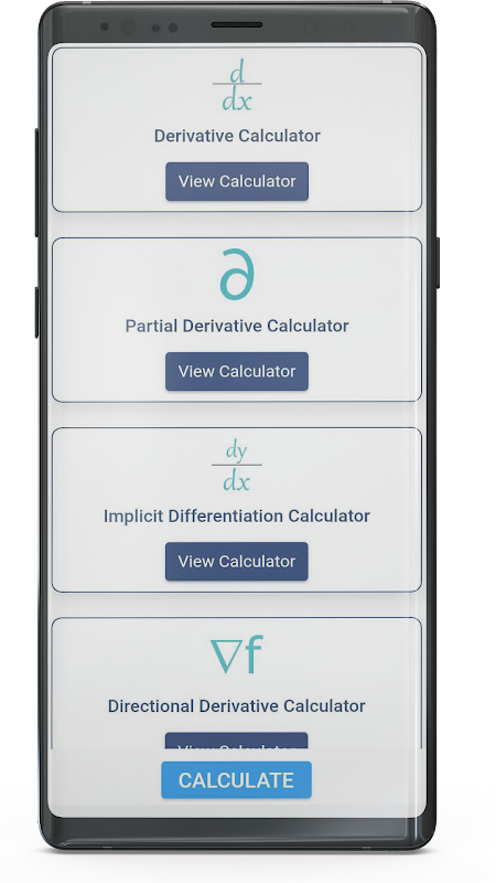 Derivative calculator with solution is a complete and easy to use calculus derivative solver. It is designed with a very easy interface of a derivative solver with a solution to provide you the computing process of derivative formulas step by step. If you are looking for a good working derivative solver app to copy or print the solutions of derivatives, this calculus solver app is a right choice for you as a calculator.