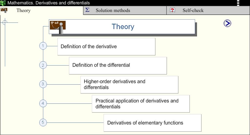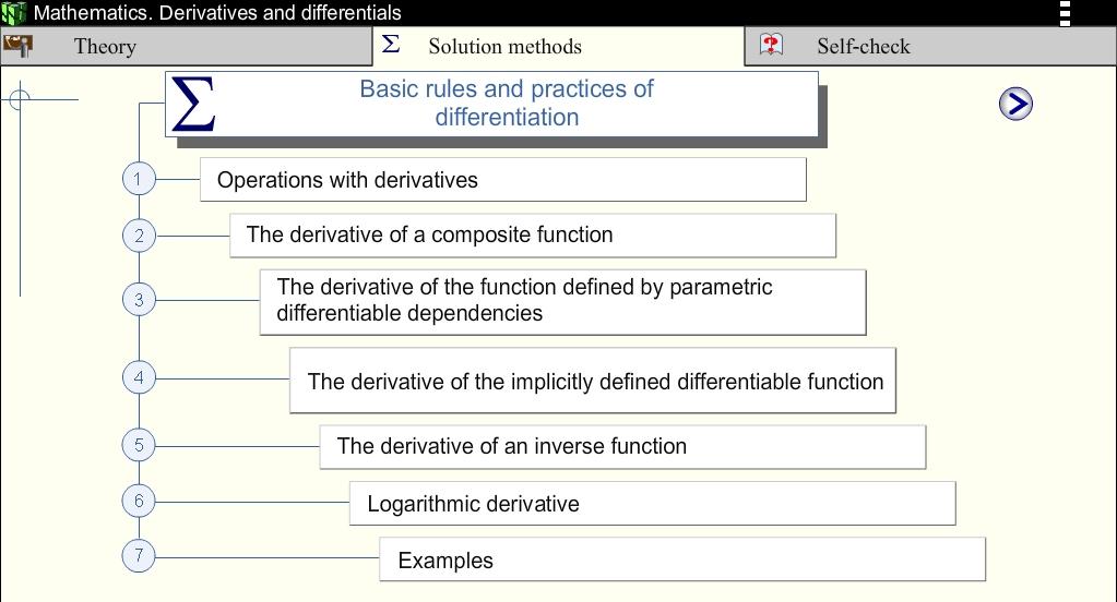 O principal objetivo da aplicação é ajudar os alunos a desenvolver os principais pontos e técnicas de diferenciação teóricas, bem como habilidades práticas na solução das tarefas mais comuns no cálculo de derivados e diferenciais.
