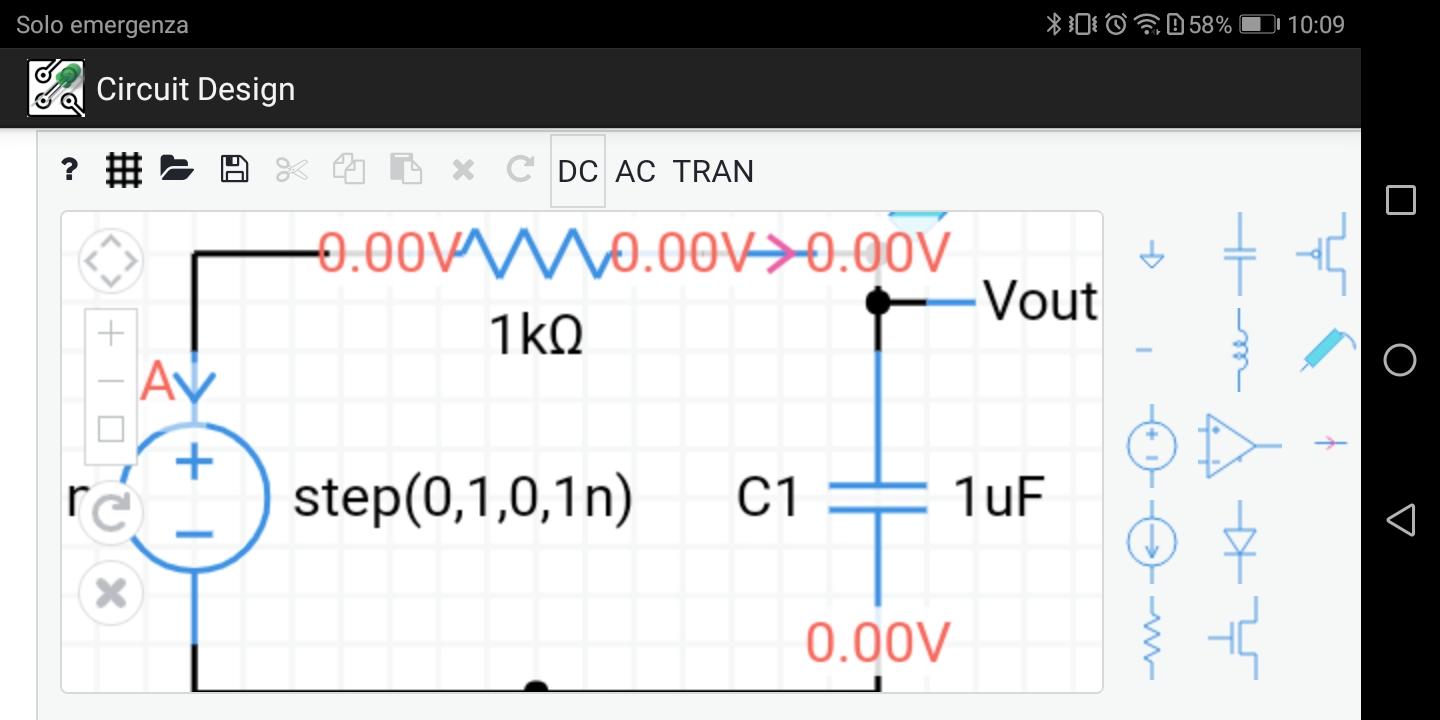 - Selecione DC, AC ou TRAN no menu para simular o circuito
