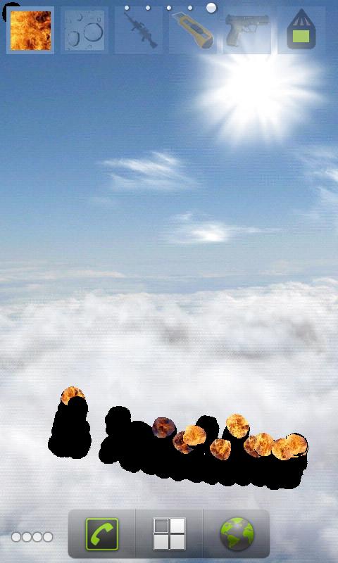 You can use Flame / Water Droplets / Machine Gun / Knife / gun / Brush / Glass Crash / Throw Egg / Foot Print / Paint to destroy and shoot the screen. Press the menu button can select or take a photo to destroy, save image to file, restore the screen, set sound, set vibration. Destroy Screen is a good tool for you to vent emotions.