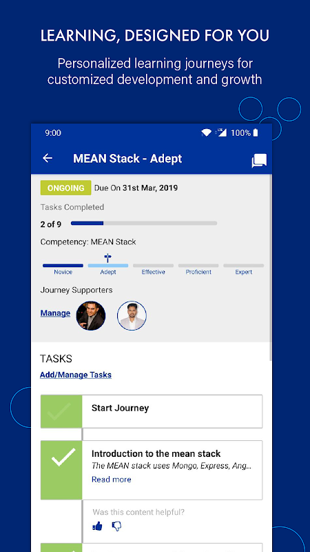 Usando AI, são recomendadas viagens de aprendizagem personalizadas baseadas no papel, experiência, plano de crescimento e preferências de estilo de aprendizagem para cada funcionário. Eles contêm conteúdo multimídia e tarefas de aprendizado de ação para ajudá-los a permanecer engajados.