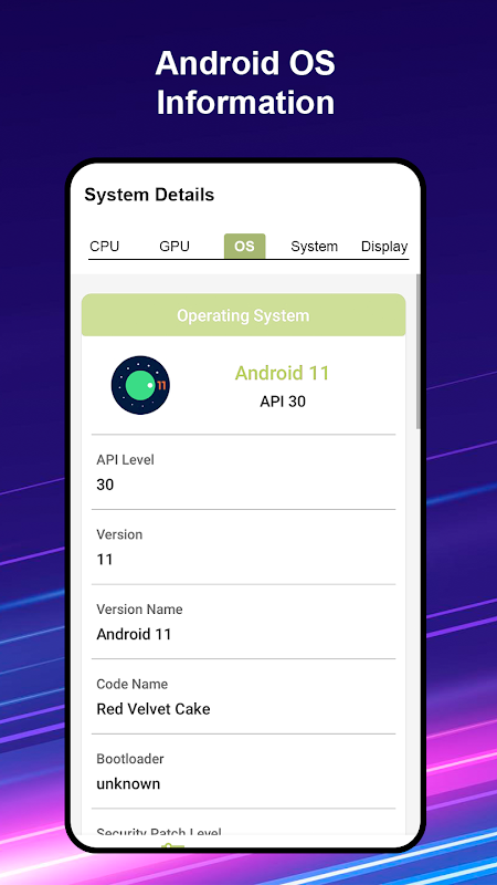 ⚙️ Sistema: obtenha informações sobre versão do sistema operacional, nome de código, nível de API, versão lançada, versão de uma UI, nível de patch de segurança, bootloader, número de compilação, banda base, Java VM, kernel, idioma, aplicativo raiz, Google Play Services, suporte Vulkan, Treble, atualizações contínuas, OpenGL ES e tempo de atividade do sistema.