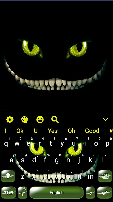 Nova noite do Diabo-gato-noite Diabo Cat está ao virar da esquina, vamos fazer o seu smartphone trazer um sorriso gatinho assustador com este criativo gatinho Horror sorriso projetado por nossa equipe criativa só para você! Obtenha este tema de teclado do gato do diabo do olho verde para seu Scary-kitty-smile livre!