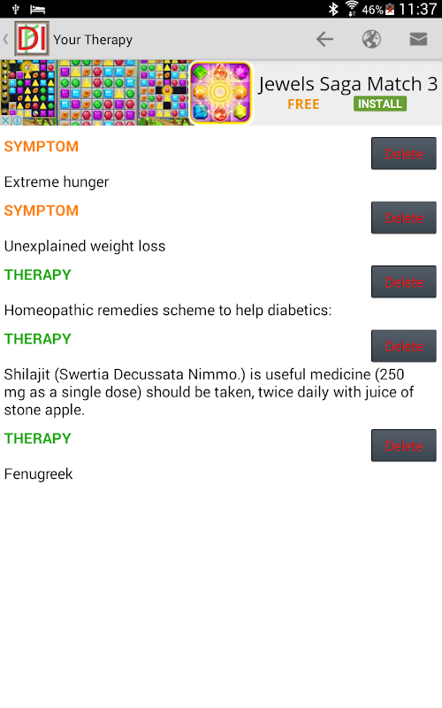 Por fim, toque em sua terapia. Você verá uma lista de sintomas (em laranja) misturado com uma lista de remédios (verde) que você selecionou. Tomados em conjunto, os sintomas e os remédios formar a sua terapia. Agora tudo que você tem a fazer é obter os remédios e iniciar o processo de uma eventual melhoria da sua saúde.