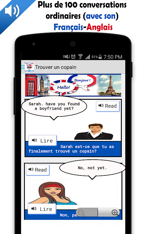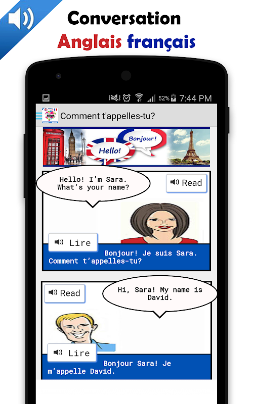 Os diálogos em francês e em inglês que o ajudam a melhorar seu nível de comunicação e saber gramática e conjugação, e aprender novas palavras em inglês e francês.