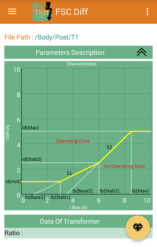 This app calculates the secondary currents of CTs and matching CTs for calculations of Idiff and Ibias for each phase, and the trip points are plotted on the stability characteristic of the differential relay, and you can easily see the performance of the transformer differential protection relay.