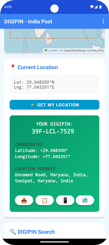 Copie ou compartilhe facilmente seu DigiPIN, coordenadas ou endereço por meio de aplicativos de mensagens, e-mail, etc.