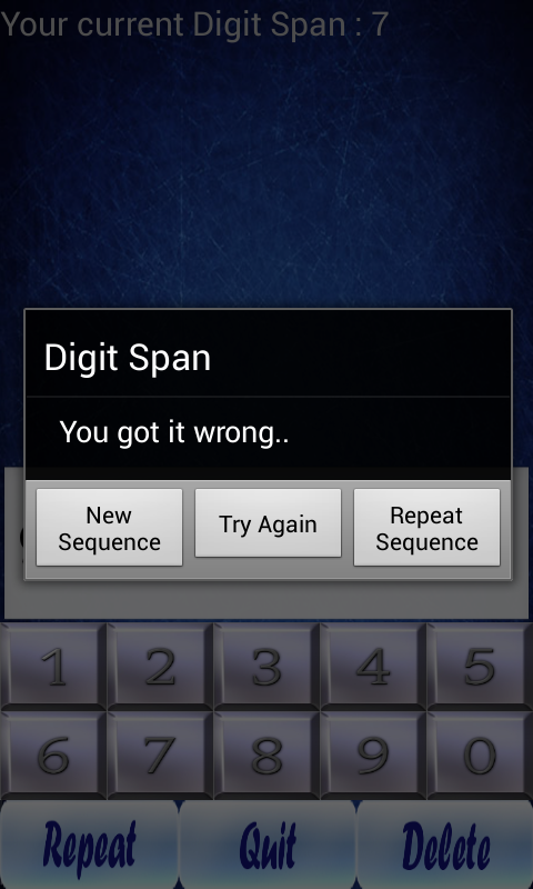 The digit span task exercises your verbal working memory. Scientists refer to working memory as the cognitive system that allows the temporary storage and manipulation of information. Verbal working memory is involved in many everyday tasks, from remembering your friend's telephone number while you enter it into your phone, to understanding long and difficult sentences. Think about it; how could you understand a whole sentence if you couldn't remember the words at the beginning long enough to connect with the words at the end! Verbal working memory is also thought to be one of the elements underlying intelligence (or 'IQ'); thus, the digit span task is a common component of many IQ tests, including the widely used WAIS (Wechsler Adult Intelligence Scales).