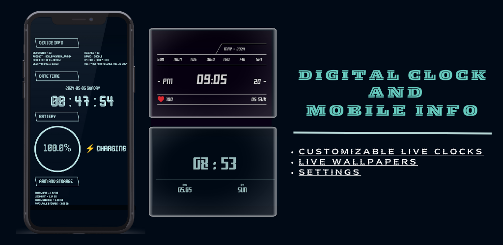 Relógio digital e informações móveis Live Wallpaper é a ferramenta definitiva para exibir um relógio digital moderno e informações móveis essenciais diretamente na tela do seu telefone. Aprimore seu dispositivo com um papel de parede animado elegante e informativo.