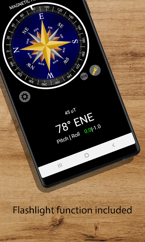 Este aplicativo mostrou a direção magnética ao usuário usando o campo magnético e os sensores do acelerômetro. Também mostrou ao usuário o parâmetro pitch and roll para ajustar o smartphone para encontrar a orientação correta. Esses parâmetros mudam para a cor verde quando o smartphone está na posição horizontal e são exibidos na parte inferior da tela. A orientação é exibida simulando uma bússola analógica. Além disso, o aplicativo possui uma função de lanterna, que pode ser configurada para enviar um sinal SOS. Para que a bússola funcione corretamente, seu dispositivo deve possuir sensores acelerômetro e giroscópio.