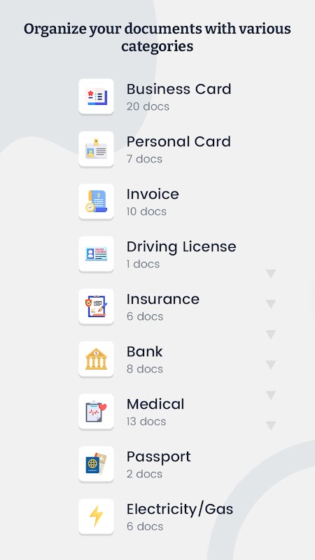 O Organizador Digital de Documentos é o aplicativo definitivo de digitalização e gerenciamento de arquivos para digitalizar, armazenar, organizar e proteger todos os seus documentos importantes em um só lugar. Sejam PDFs, fotos, arquivos do Word ou carteiras de identidade, este cofre digital ajuda você a se manter organizado e sem papel.