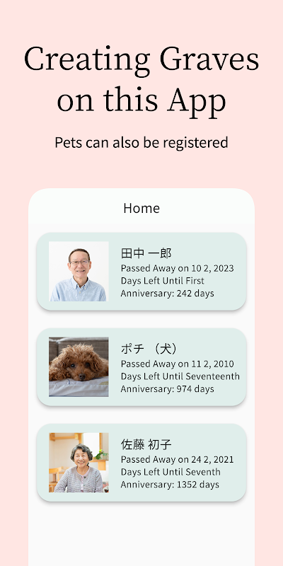 Com este aplicativo, você pode criar túmulos para entes queridos falecidos e animais de estimação online. Ele permite que você preste homenagens on-line no túmulo e verifique e defina notificações para datas de serviços fúnebres. Ao colocar códigos QR em sepulturas reais, você pode oferecer oportunidades para muitas pessoas visitarem e prestarem homenagens.