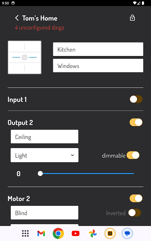 - Proteja todos os dingz dentro de casa com uma senhaAo clicar em um dingz você poderá configurar suas saídas e testá-las diretamente através do aplicativo. Fácil e simples.