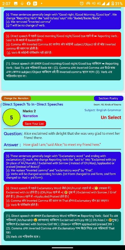 É um aplicativo muito poderoso para alterar a narração. O aplicativo de fala direta e indireta tem muitas tarefas com exemplos. Baseia-se principalmente em frases simples, frase assertiva, frases interrogativas, frases Imparativ, frases exclamativas. Ele também mostra como usar tempos como pretérito, presente e futuro.