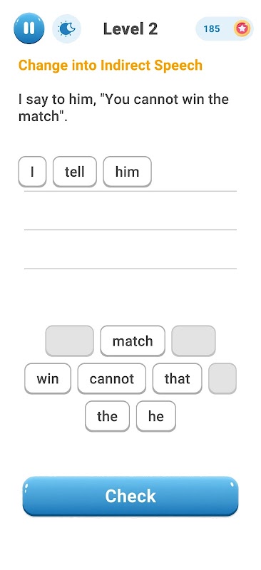 Todos os tipos de perguntas de sentença estão incluídos: assertiva, interrogativa, imperativa, exclamativa e optativa. Também são dadas frases que mudam de indireta para direta.