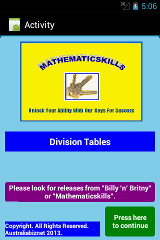 For younger children we suggest the sister application from Australiabiznet which is sold under the branding of "Billy ‘n’ Britny" and is called Division Level 1. The sister application: has sound; contains basic exercises; fewer tables [up to “9”]; and more basic testing activities.