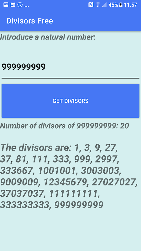 La aplicación calcula los divisores de cualquier número natural hasta 999 999 999.